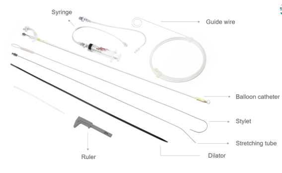O conjunto de cateter de balão para PBMV é contém: Cateter de balão, Fio-guia, Dilatador, Estilete, Tubo de alongamento, Régua e Seringa.
